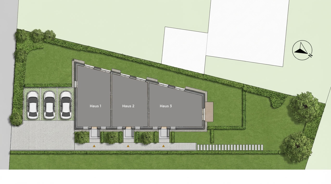 Pro Haus steht ein eigener Stellplatz mit Vorbereitung für E-Mobilität zur Verfügung, während vor den Häusern praktische Fahrradständer entstehen. Darüber hinaus lädt ein gemeinschaftlicher Garten mit über 150 m² Fläche zum Spielen, Begegnen und Verweilen ein. Wer zusätzlichen Stauraum wünscht, kann optional einen eigenen Schuppen im privaten Garten aufstellen – für Gartengeräte, Fahrräder oder alles, was das Familienleben mit sich bringt.